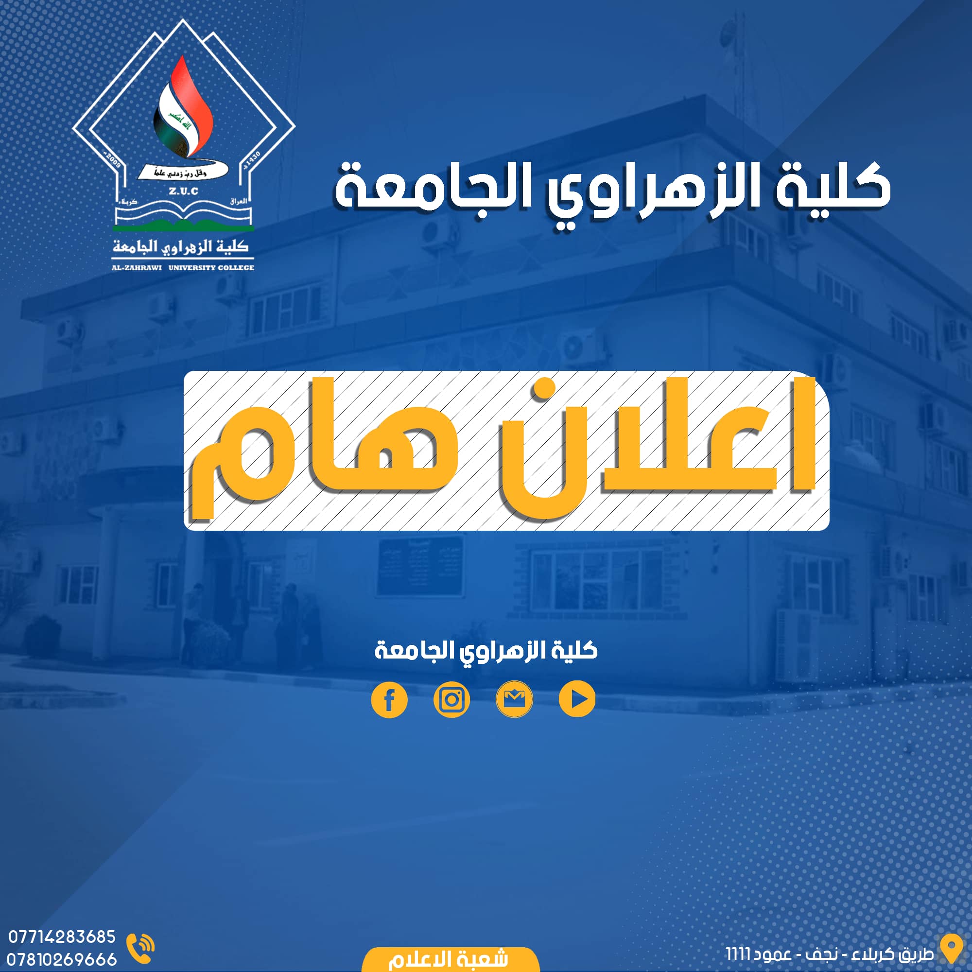 الى كافة طلبتنا الأعزاء المرحلة الاولى المقبولين لهذا العام ضمن القنوات الخاصة وهي قناة ذوي الشهداء/ قناة ابناء الاساتذة / قناة ابناء حملة الشهادات العليا/ في كافة الأقسام العلمية مراجعة شعبة التسجيل في بناية عمادة الكلية الطابق الاول لتكملة إجراءات التسجيل