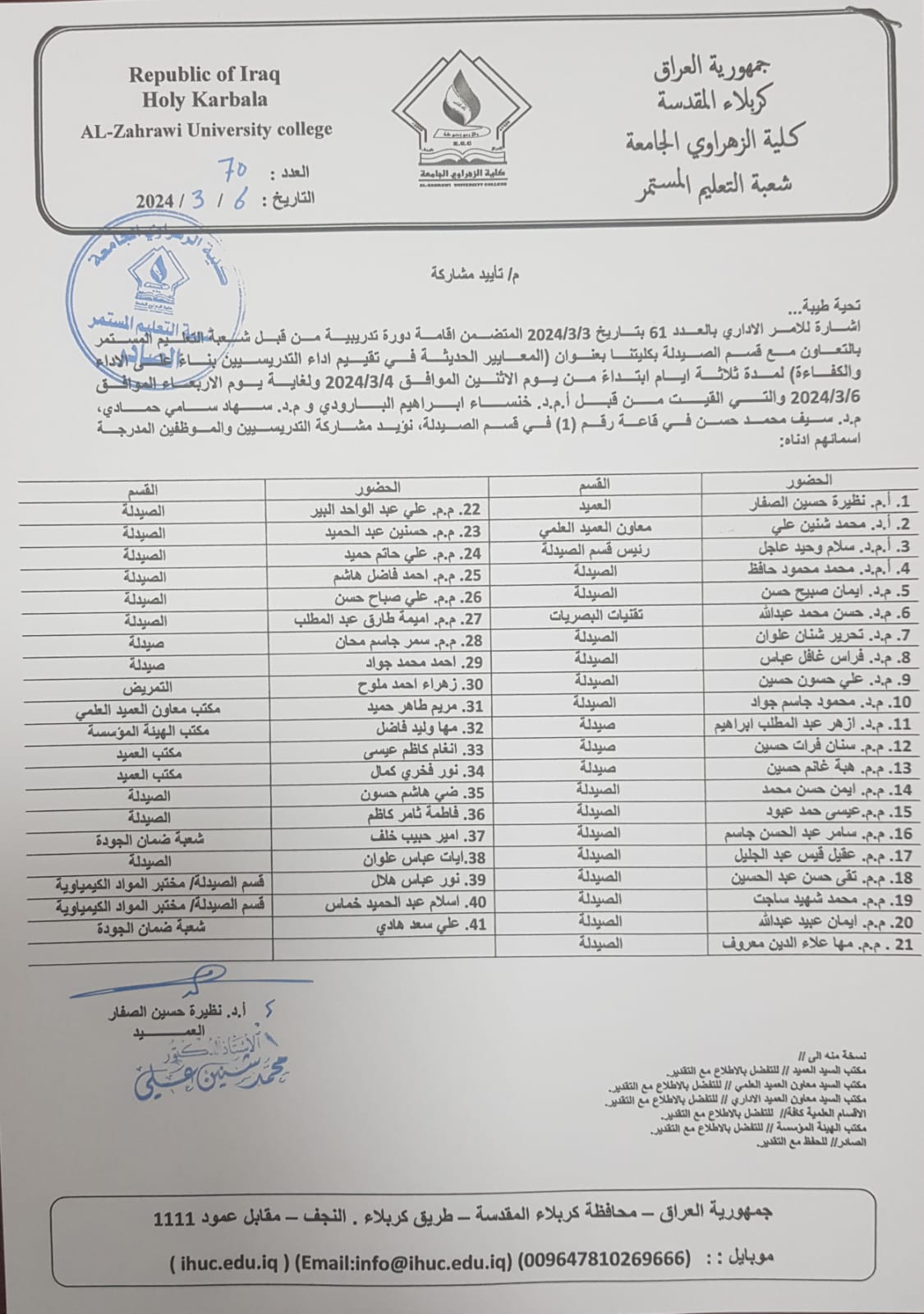 اقامة دورة تدريبية منقبل التعليم المستمر بالتعاون مع قسم الصيدلة بكليتنا بعنوان المعاير الحديثة في تقيم اداء التدرسين