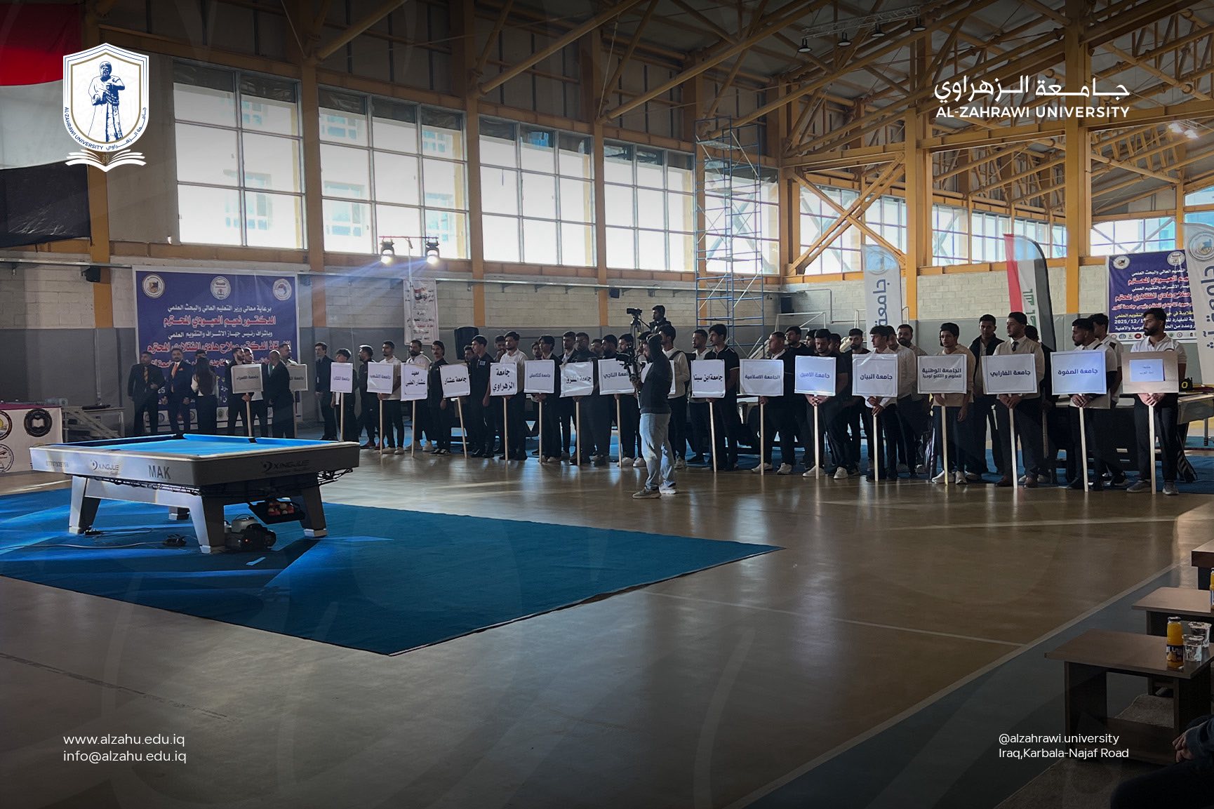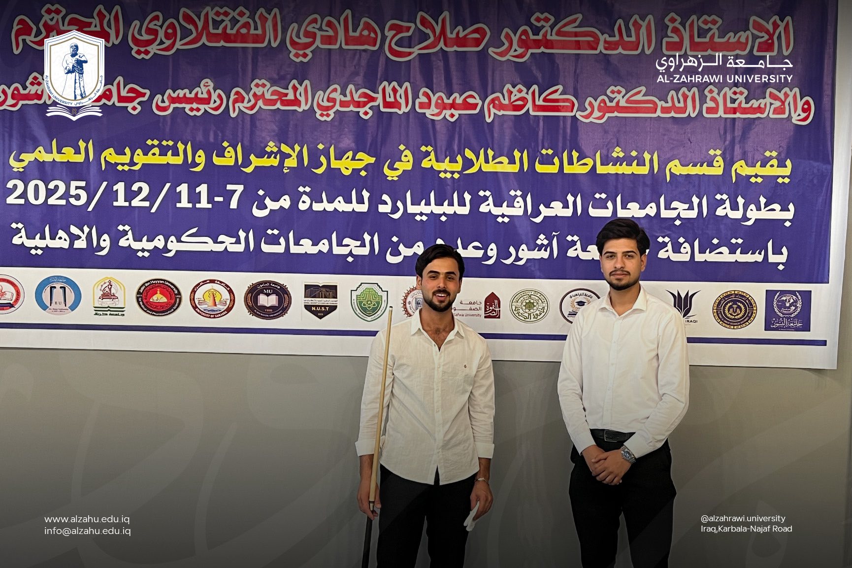 برعاية معالي وزير التعليم العالي والبحث العلمي الدكتور نعيم العبودي المحترم، وبإشراف رئيس جهاز الإشراف والتقويم العلمي الأستاذ الدكتور صلاح هادي الفتلاوي المحترم، وبمتابعة ودعم السيدة رئيس جامعة الزهراوي، شاركت جامعة الزهراوي في بطولة الجامعات العراقية للبليارد التي استضافتها جامعة آشور، بمشاركة أكثر من (50) جامعة حكومية وأهلية.