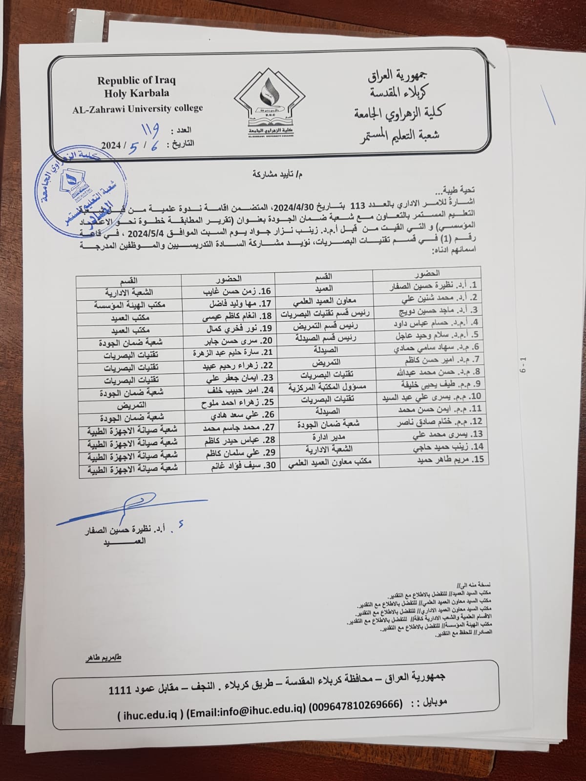 اقامة دورة تدريبة من قبل شعبة التعليم المستمر بالتعاون مع قسم الصيدلة بعنوان (polluted air-the invisible killer )